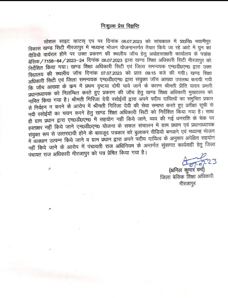 सोशल साइट व्हाटस् एप पर दिनांक 06.07.2023 को सांयकाल में प्रा०वि० भवानीपुर विकास खण्ड सिटी मीरजापुर में मध्यान्ह भोजन योजनान्तर्गत तैयार किये जा रहे आटे में घुन का वीडियो वायरल होने पर उक्त प्रकरण की स्थलीय जाँच हेतु अधोहस्ताक्षरी कार्यालय के पत्रांक बेसिक/7158-64/2023-24 दिनांक 06.07.2023 द्वारा खण्ड शिक्षा अधिकारी सिटी मीरजापुर को निर्देशित किया गया। खण्ड शिक्षा अधिकारी सिटी एवं जिला समन्वयक एम०डी०एम० द्वारा उक्त विद्यालय की स्थलीय जाँच दिनांक 07.07.2023 को प्रातः 09:15 बजे की गयी। खण्ड शिक्षा अधिकारी सिटी एवं जिला समन्वयक एम०डी०एम० द्वारा संयुक्त जांच आख्या उपलब्ध करायी गयी कि जाँच आख्या के क्रम में प्रथम दृष्टया दोषी पाये जाने के कारण श्रीमती प्रीति यादव प्रभारी प्रधानाध्यापक को निलम्बित करते हुए प्रकरण की जाँच हेतु खण्ड शिक्षा अधिकारी मुख्यालय को नामित किया गया है। श्रीमती गिरिजा देवी रसोईयों द्वारा अपने पदीय दायित्वों का समुचित प्रकार से निर्वहन न करने के आरोप में श्रीमती गिरिजा देवी की सेवा समाप्त करते हुए प्रतीक्षा सूची से नयी रसोईयों का चयन करने हेतु खण्ड शिक्षा अधिकारी सिटी को निर्देशित किया गया है। साथ ही ग्राम प्रधान द्वारा एम०डी०एम० में सहयोग नहीं किये जाने, व्यय की गई धनराशि के चेक पर हस्ताक्षर नहीं किये जाने एम०डी०एम० योजना के सफल संचालन में ग्राम प्रधान एवं प्रधानाध्यापक संयुक्त रूप से उत्तरदायी होने के बावजूद पत्रकार को बुलाकर वीडियो बनवाने एवं मध्यान्ह भोजन में व्यवधान उत्पन्न किये जाने व ग्राम प्रधान द्वारा अपने पदीय दायित्व के अनुरूप अपेक्षित सहयोग नहीं किये जाने के आरोप में पंचायती राज अधिनियम के अन्तर्गत सुसगत कार्यवाही हेतु जिला पंचायत राज अधिकारी मीरजापुर को पत्र प्रेषित किया गया है।
