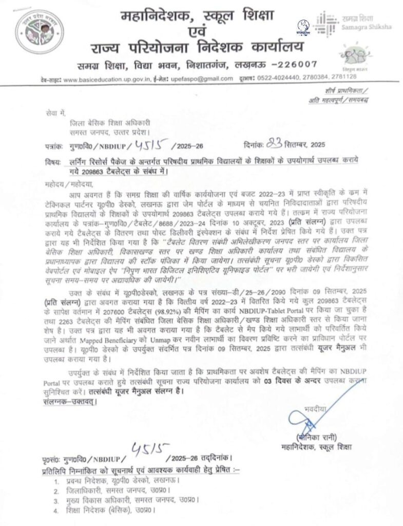 कृपया राज्य परियोजना कार्यालय के संलग्न पत्र का संदर्भ ग्रहण करने का कष्ट करें, जो कि परिषदीय विद्यालयों में शिक्षकों के उपयोगार्थ उपलब्ध कराए गए टैबलेट्स के मैपिंग का कार्य UPNBDI Portal पर कराए जाने के संबंध में है। अद्यतन 98.92% टैबलेट की मैपिंग UPNBDI Portal(https://upnbdi.in) पर की गई है तथा शेष 2263 टैबलेट की मैपिंग कराया जाना अपेक्षित है।